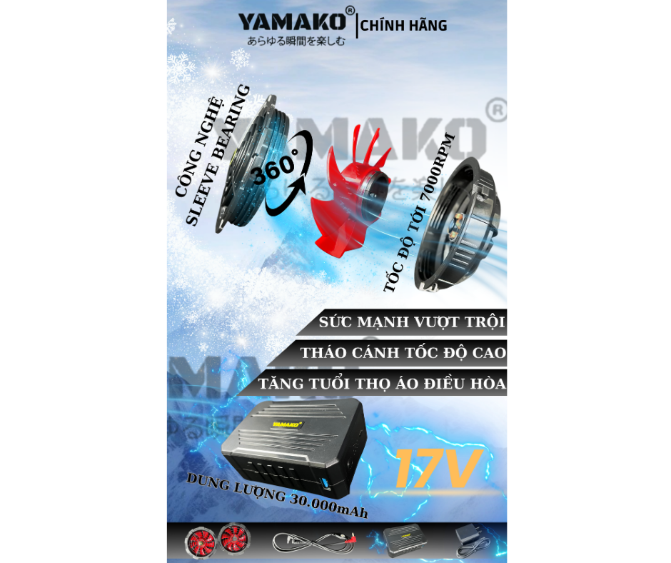 Áo điều hòa Yamako được trang bị pin lithium 17V 30.000mAh hoặc 18V 20.000mAh, cho phép sử dụng liên tục từ 8 đến 16 tiếng, phù hợp với lịch trình làm việc kéo dài trong ngày. Đây là một ưu điểm vượt trội, giúp người dùng không cần thay pin giữa chừng hay sạc lại nhiều lần.