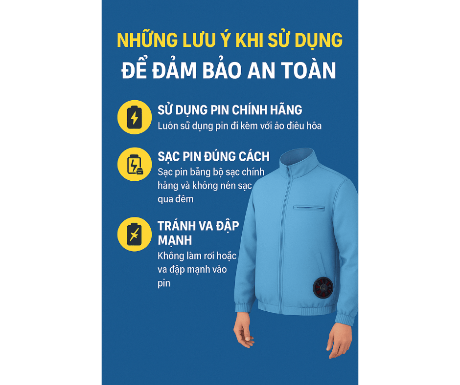 Sử dụng pin chính hãng: Luôn sử dụng pin đi kèm với áo điều hòa của bạn. Việc dùng pin không rõ nguồn gốc, kém chất lượng có thể gây ra nhiều rủi ro về an toàn.