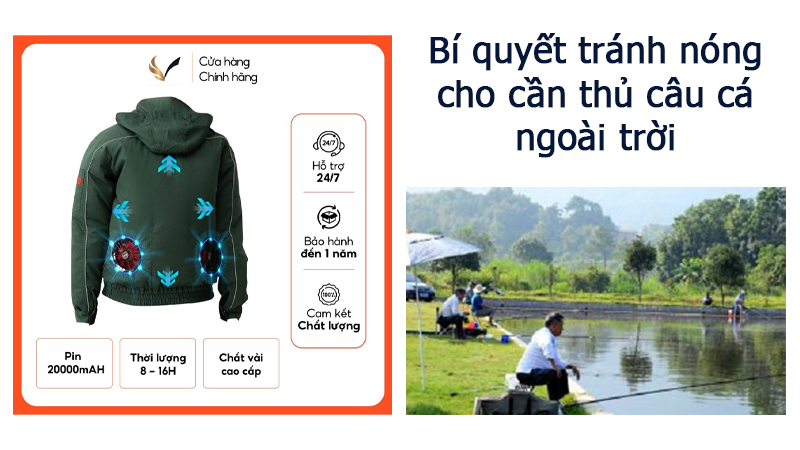 Với áo điều hòa công nghệ Nhật Bản sẽ giúp cơ thể luôn mát mẻ, thoải mái, hạn chế ra mồ hôi kết hợp với mũ, nên rất thích hợp cho người câu cá ngồi ngoài trời nắng nóng không có quạt. Bạn sẽ yên tâm ngồi câu không lo nắng nóng, mệt mỏi do quạt có thể chạy được từ 8-10h liên tục. Ngoài ra pin còn thay thế sạc dự phòng cho điện thoại nữa đấy, quá tiện cho những người đi xa mà không có ổ điện đúng không nào.