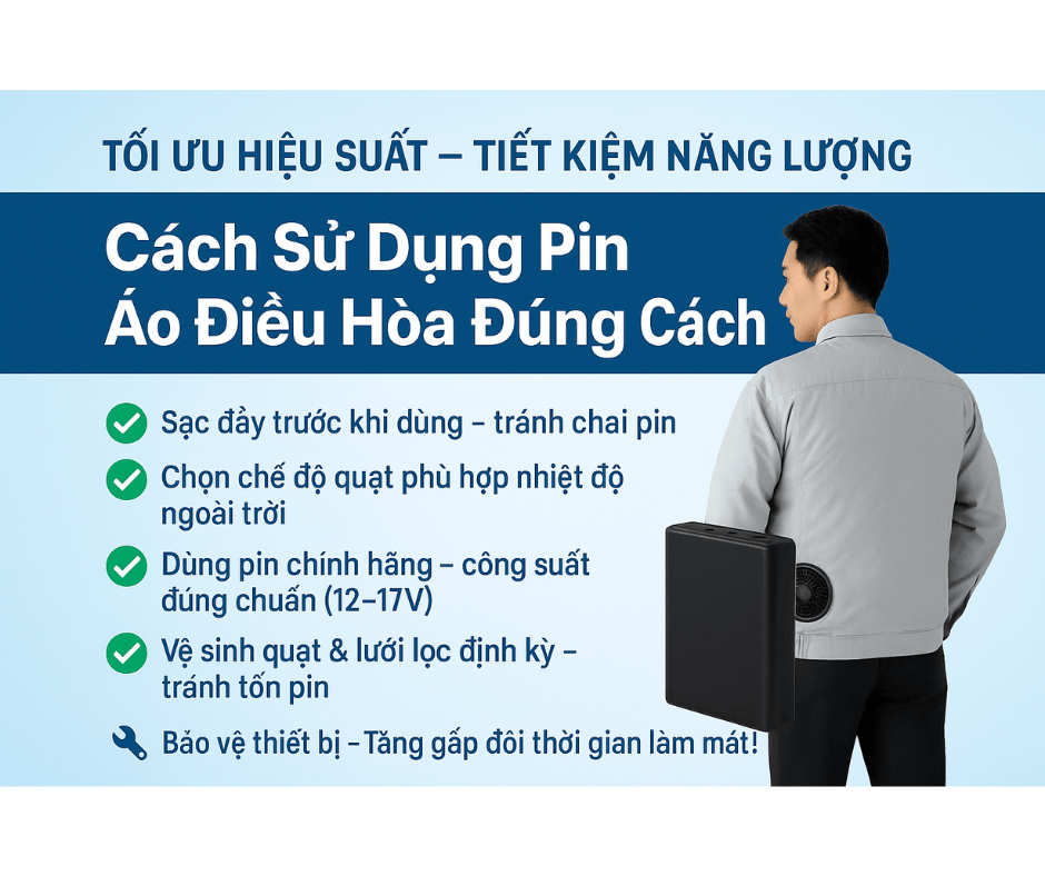 Áo điều hòa nhiệt độ đang ngày càng trở nên phổ biến với người lao động ngoài trời nhờ khả năng làm mát hiệu quả. Tuy nhiên, để áo phát huy tối đa công dụng, cách sử dụng pin cho áo điều hòa nhiệt độ đúng cách là yếu tố quan trọng. Bài viết dưới đây sẽ hướng dẫn bạn cách sử dụng và bảo quản pin để đạt hiệu quả tối ưu, tiết kiệm năng lượng và kéo dài tuổi thọ thiết bị.