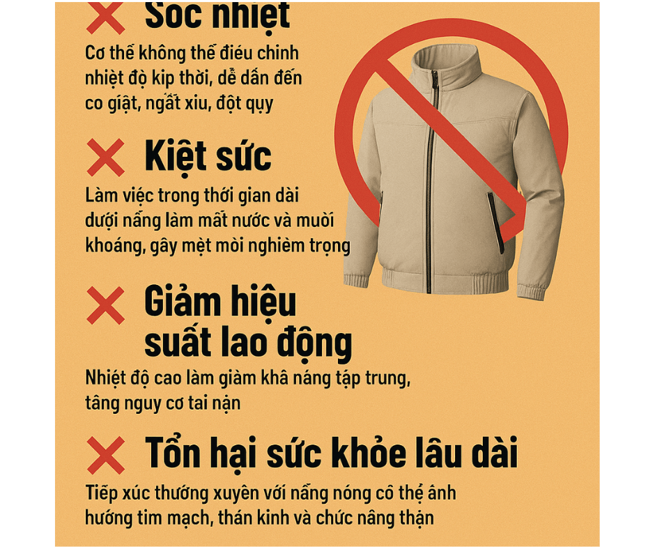 Làm việc ngoài trời nắng nóng mà không mặc áo điều hòa nhiệt độ có thể gây sốc nhiệt, kiệt sức, thậm chí tử vong. Cùng tìm hiểu lý do và giải pháp bảo vệ sức khỏe!