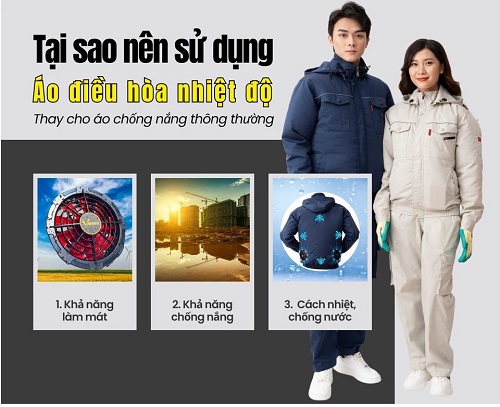 Khi đó, quần áo bảo hộ lao động sẽ là phương pháp chống nắng tốt nhất. Tuy nhiên, quần áo chống nắng thông thường dường như chỉ giúp giảm bớt cảm giác bỏng rát. Nhưng nếu sử dụng 1 chiếc áo khoác điều hòa không chỉ giúp chúng ta chống nóng mà còn làm mát cơ thể rất hiệu quả.