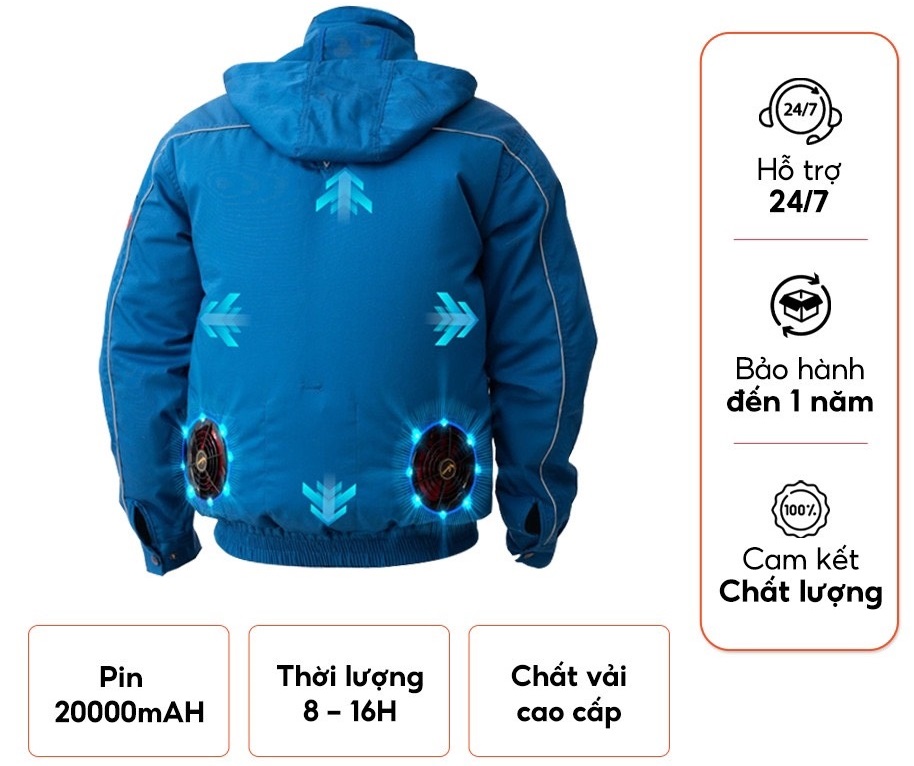 Quạt gắn áo điều hòa: Hai chiếc quạt gió mini có nhiệm vụ hút không khí từ bên ngoài vào bên trong áo. Tạo ra luồng gió mát lưu thông trong người giúp đẩy nhanh quá trình thoát mồ hôi.