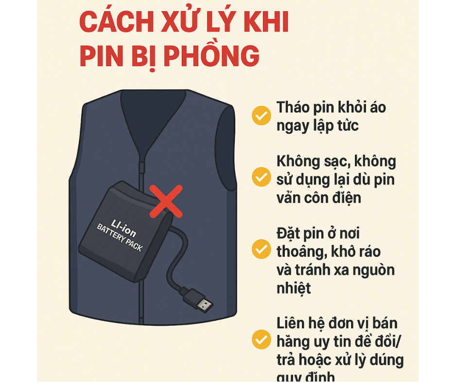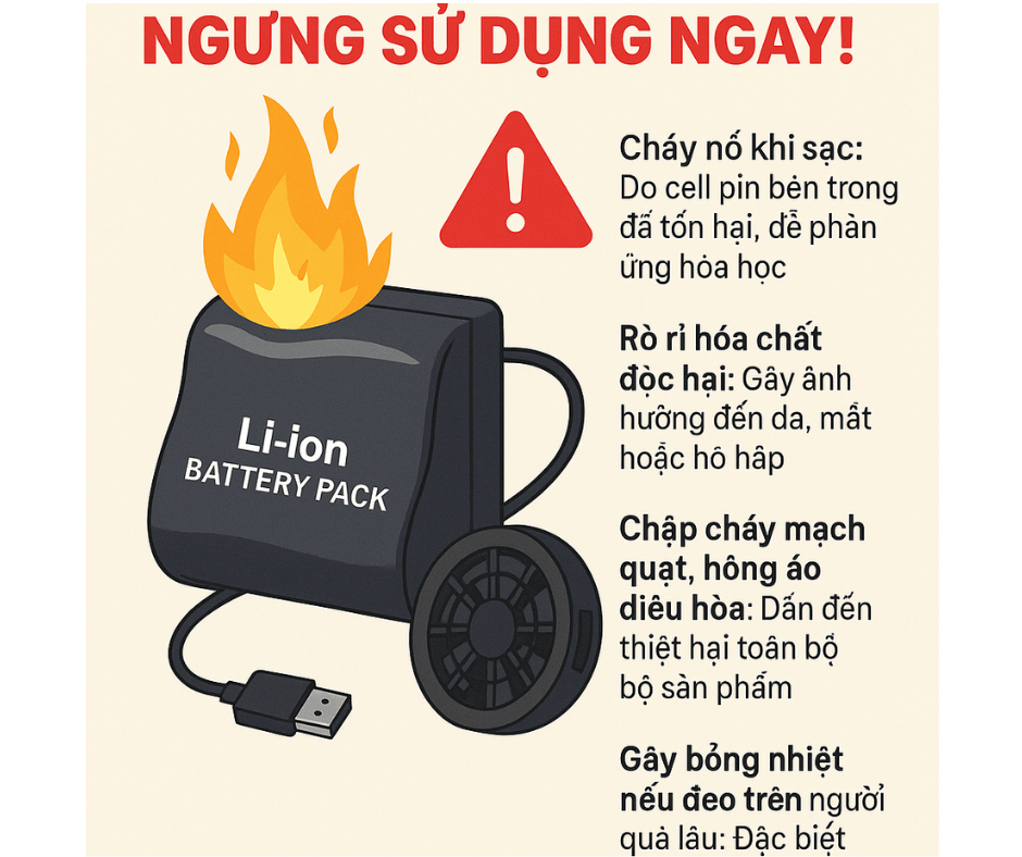 Trong quá trình sử dụng áo điều hòa, nếu bạn phát hiện pin bị phồng, nóng bất thường hoặc có dấu hiệu biến dạng, hãy ngừng sử dụng ngay lập tức. Đây không chỉ là dấu hiệu cảnh báo pin sắp hư, mà còn tiềm ẩn nguy cơ cháy nổ cực kỳ nghiêm trọng!